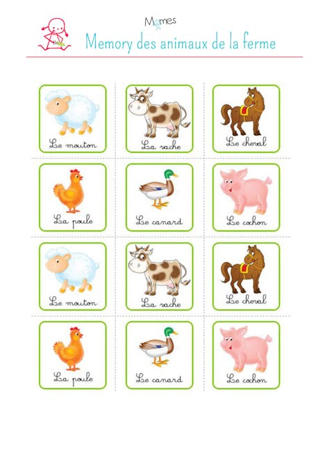 36 images d'animaux de la ferme pour des jeux de memory Personnellement j'ai imprimé le mémory en 3 exemplaires 2 exemplaires Memory classique ( trouver les deux images identiques) 1 exemplaire pour faire 3 jeux de memory 1 associer le mâle et la femelle;. Imagiers pour travailler le vocabulaire en maternelle Ces fiches de vocabulaire en français peuvent aussi être utilisées en élémentaire Elles sont présentées au format A5 avec le mot écrit dans les trois écritures capitale, script et cursive. 30 janv 17 Jeu de memory matériel un jeu de 18 paires à imprimer, pour 2 joueurs ou plus On peut varier le nombre de cartes utilisé.