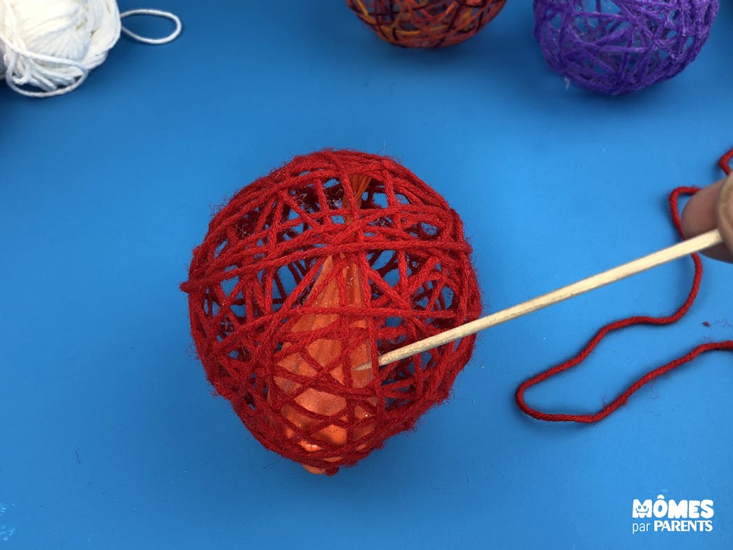 Quand la boule de ficelle est dure vous pourrez crever votre ballon en baudruche et retirer le noeud Ainsi vous obtiendrez une boule de Noël en ficelle Vous pourrez utilisez de la laine aux couleurs de Noël ou des écheveaux de coton blanc pour broderie.