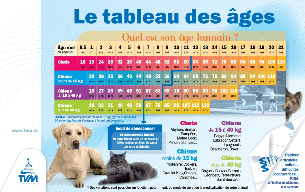 Age moyen des chiens selon leur race ©Wedodata sous Creative Commons Ainsi, un petit chien (c’estàdire un chien qui pèse moins de 15 kg à l’âge adulte) atteint 100 ans « humains » à ans alors qu’un chien de grande race (plus de 40 kg) devient centenaire à 12 ans Toutefois, en début de vie, c’est l’inverse un petit. Calculer l'âge de son chien Comment évaluer l'âge d'un chien La façon d'évaluer l'âge d'un chien est assez aléatoire, mais il existe tout de même une technique assez fiable Pour calculer l'âge humain du chien, il ne s'agit pas de multiplier par sept son âge de chien En effet, la première année de vie du chien correspond à 18 ans. Quand votre chien entrera dans sa période sénescence 10 ans pour un chien de moins de 15kg, 9 ans pour un chien entre 15kg et 40kg, 7 ans pour un chien de plus de 40kg, il est conseillé de faire un bilan de santé de votre chien par votre vétérinaire En effet, votre chien ne présenta pas soudainement des signes de sénilité.