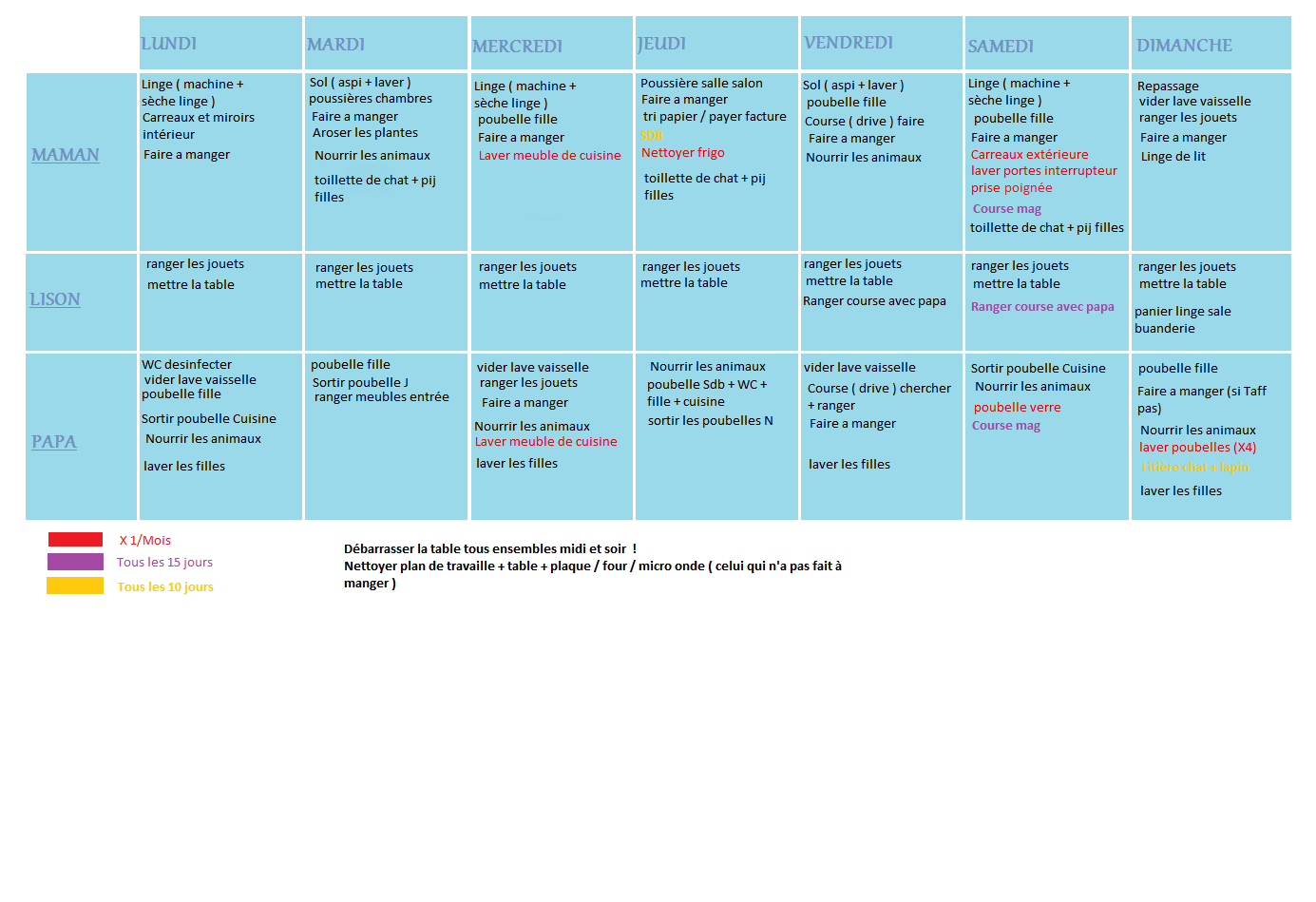 Mettre en place un planning ménage quotidien et hebdomadaire Ma proposition d’établir un planning ménage quotidien et hebdomadaire s'adresse aux tâches ménagères à proprement dites Celuici est imparable pour ne plus se sentir débordée. 3 juil Répartition des tâches ménagères sur l'année Voir plus d'idées sur le thème menage, astuce menage, planning ménage. L’entretien d’une maison est souvent un calvaire et un planning ménage peutêtre difficile à concevoir Tâche obligatoire dont il faut s’acquitter quotidiennement, le ménage nous prend du temps Pour se sentir bien dans sa maison, il faut avoir un intérieur propre et ordonné Mais par où commencer ?.