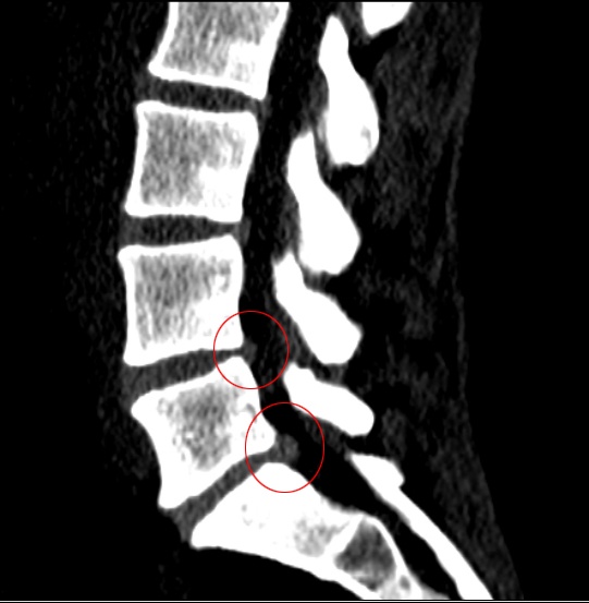 C’est le cas de ceux situés dans le bas de la colonne vertébrale, les disques L5 S1 (entre la 5e vertèbre lombaire et la première vertèbre du sacrum) et L4 L5 (entre la 4e et la 5e.