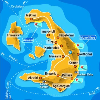 Carte de Santorin (Santorini) On voit bien Fira (Thira sur la carte, au centre, c’est un port d’arrivée), Oia, au nord et la forme du volcan !. Bref, un vrai décor de carte postale !. Optez pour un combiné ensoleillé vous invitant à la découverte et au farniente La carte postale de Santorin, les sublimes plages de Naxos, chacune de ces îles possède sa particularité qui saura vous faire tomber sous le charme !.