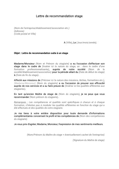 Lettre de recommandation pour un stage cliquez pour agrandir Téléchargez ce modèle de lettres Téléchargement d'un modèle de lettres Je télécharge mon document en choisissant le format rtfdoc;. La lettre de recommandation est une lettre rédigée par un employeur en faveur d'un ancien salarié (ou stagiaire) et dans laquelle l'employeur (ou le maître de stage) indique les qualités professionnelles et les compétences dont le salarié a fait preuve pendant la période où celuici était présent dans l'entreprise Dans le monde du. Modèle de lettre de recommandation pour un stage A , le Madame, Monsieur, a travaillé pour.