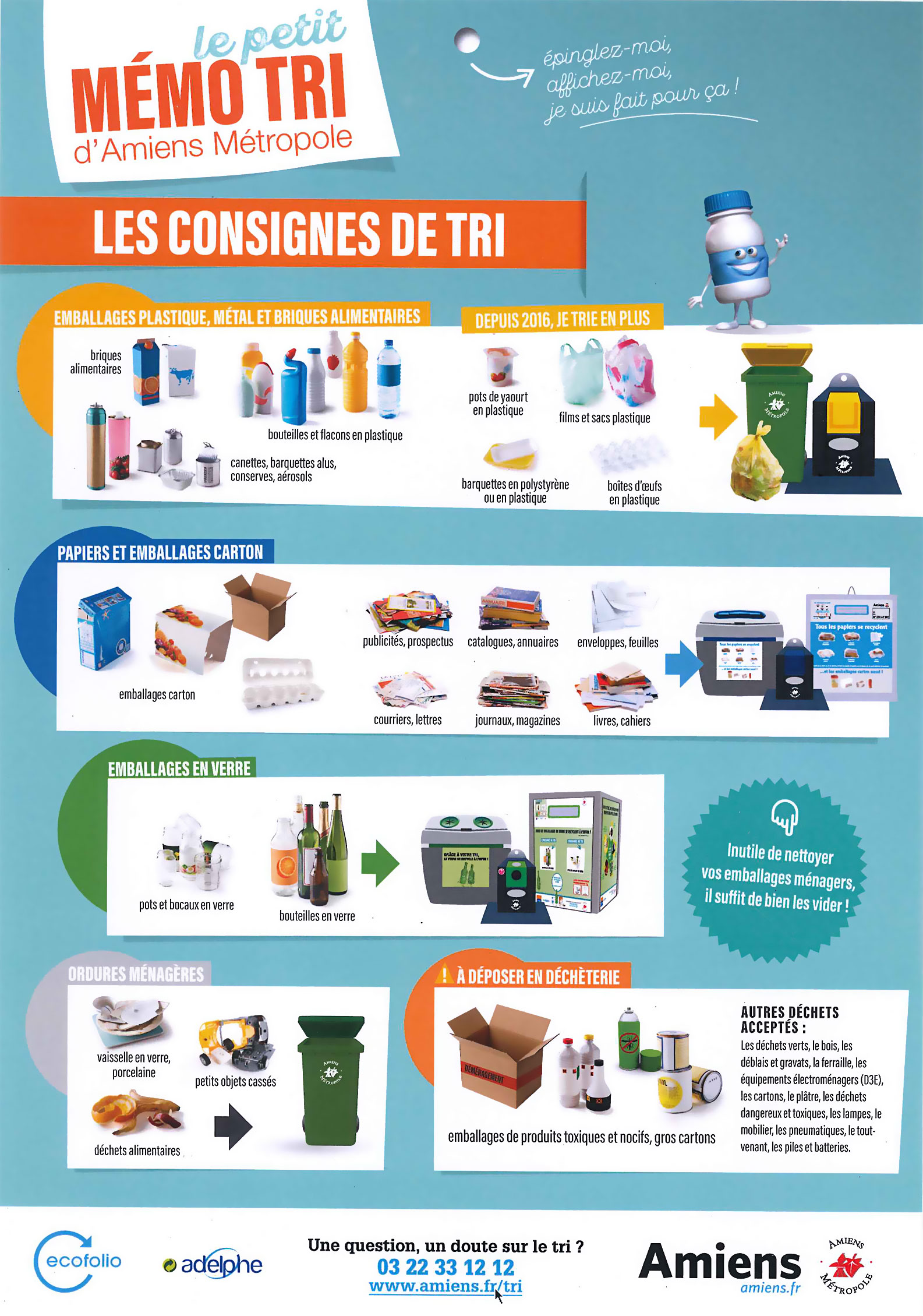 Certaines communes expérimentent des consignes de tri différentes, notamment sur le plastique Les règles indiquées cidessus sont celles qui ont été le plus généralement mises en place en France En cas de doute, contactez votre Mairie ou votre Syndicat Intercommunal ou rendezvous sur le Guide du tri. Parce que sans votre geste, le recyclage des emballages ne peut avoir lieu, la Métropole s’est engagée, aux côtés d’Adelphe, dans 4 projets visant à relancer le tri et la collecte des emballages ménagers Au cœur de ces projets, on retrouve la question de l’accessibilité du dispositif de tri pour les habitants. Trier, c’est jeter les bons déchets dans les bons bacs, sacs ou points de collecte suivez le guide !.