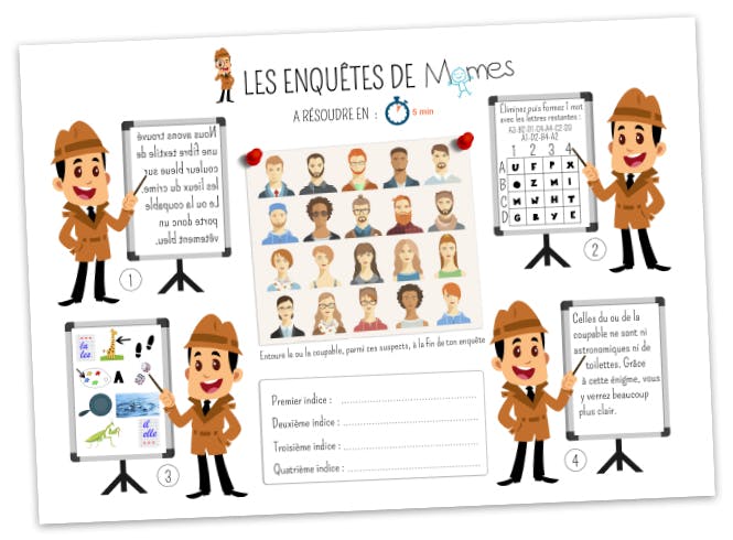 Un kit gratuit à imprimer pour enfant sur une enquête policière avec énigmes à faire à la maison Petites Chasses au Trésor par Coline et RémyChasses au Trésor. 4 avr 16 Enquête policière pour enfant sur le voleur de collier !. Enquetes policières Jeu de couple EVGEVJF Ajouter au panier Kit Enquête policière 1377 ans 35€ Idéale pour animer une soirée entre amis, l'Enquête policière est un Cluedo géant Plongez dans une enquête policière grandeur nature !.