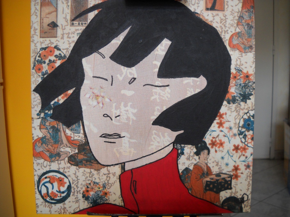 Peinture Tableau En Collage Et Peinture Acrylique Femme Asiatique