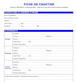 Télécharger et prévisualiser 1 page au format PDF de Fiche de demande et de suivi des travaux (DOC 14 KB PDF 1161 KB ) gratuitement. DE CHANTIER BATIMENT Koné 28 aout 13 Philippe DI MAGGIO Section prévention des parleton Prévention des risques professionnels liés à la coactité des entreprises sur les chantiers de construction de bâtiments Coordonnateur SPS (sécurité, protection de la santé) Le travailleur indépendant qui n’a pas suivi un accueil. Je viens de détailler très rapidement en remplissant les cases de la feuille rapport journalier et du suivi de chantier En espérant que ça aide un peu Mon principal soucis c'est que je ne sais pas comment créer de base de données dans les feuilles 3,4,5,6 et les exploiter en les ajoutant dans le rapport journalier et le suivi de.