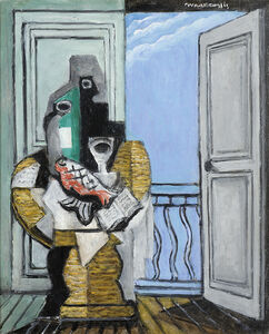 While Nature morte retains a pareddown effect achieved by the accumulation of stylised forms and geometric lines, it also presents a tableau brimming with life, from the nature seen through the window to the suggestion of human presence in the depiction of everyday objects on a table top.