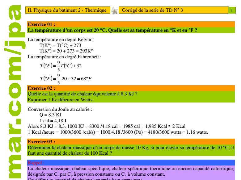 11 Les diff´erents modes de transferts Lorsque deux syst`emes sont a des temp´eratures diff´erentes, le syst`eme le plus chaud c`ede de la chaleur au plus froid Il y a ´echange thermique ou encore transfert thermique entre ces deux syst`emes Cette situation se rencontre dans de nombreuses. Exercices de Thermodynamique (corrigés détaillés)pdf Exercices de Thermodynamique (corrigés détaillés)pdf Sign In Details. Introduction des notions de flux thermique et de résistance thermique Des exercices d'application (calcul de R, application dans le bâtiment et comparaison exercices corriges pdf.